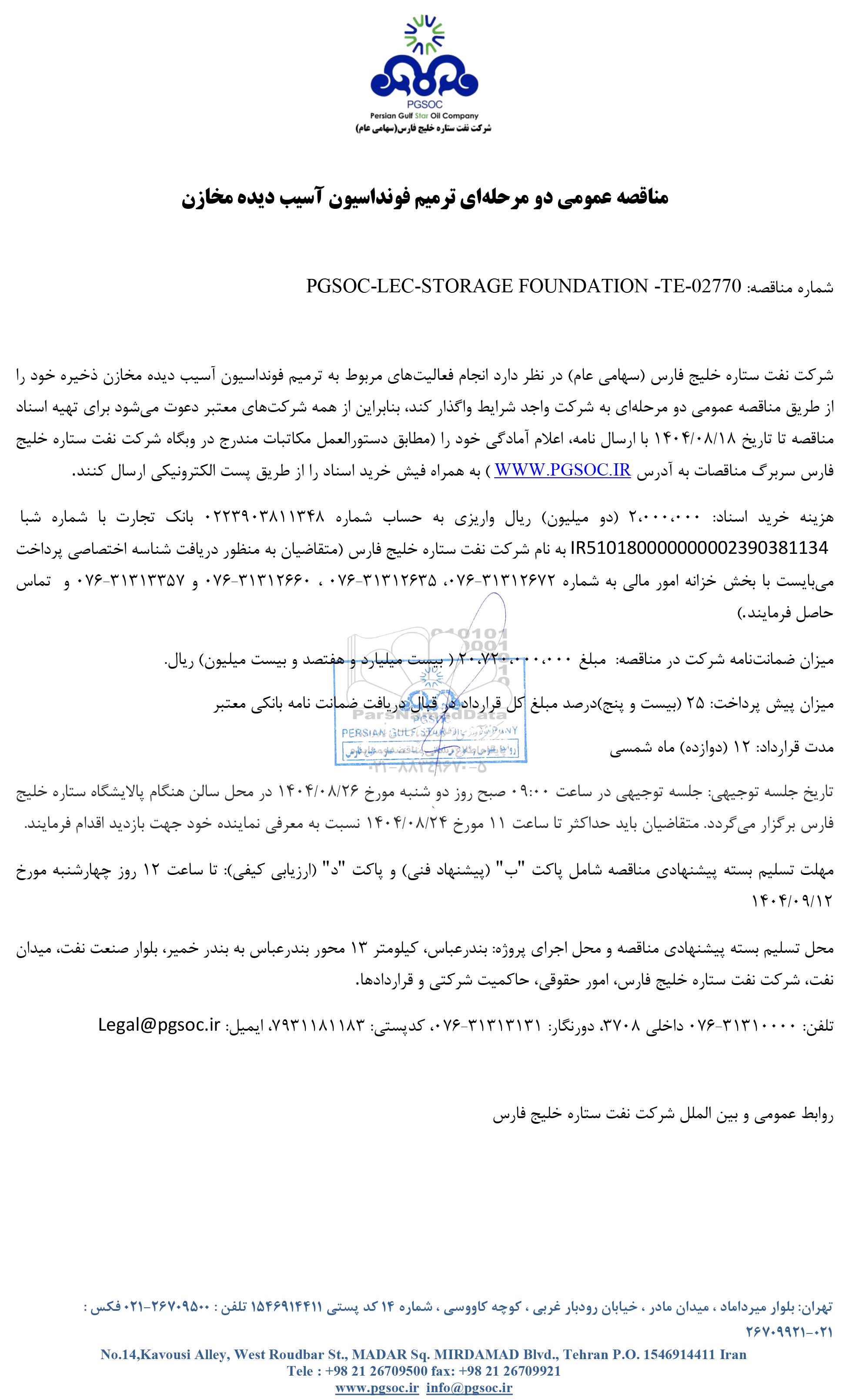 شماره مناقصه: PGSOC-LEC-STORAGE FOUNDATION -TE- 02770