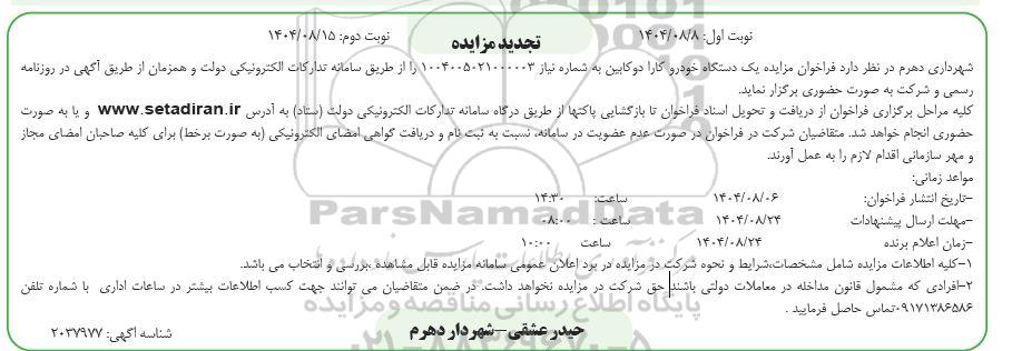 شهرداری دهرم در نظر دارد فراخوان مزایده یک دستگاه خودرو کارا دوکابین به شماره نیاز 1004005021000003 را از طریق سامانه تدارکات الکترونیکی دولت و همزمان از طریق آگهی در روزنامه رسمی و شرکت به صورت حضوری برگزار نماید.