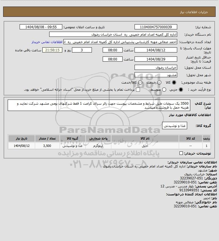 شرح کلی نیاز: 3500 پک سوغات طبق شرایط و مشخصات پیوست جهت زائر سرای کرامت 1 فقط شرکتهای بومی مشهد شرکت نمایند و هزینه حمل با فروشنده میباشد