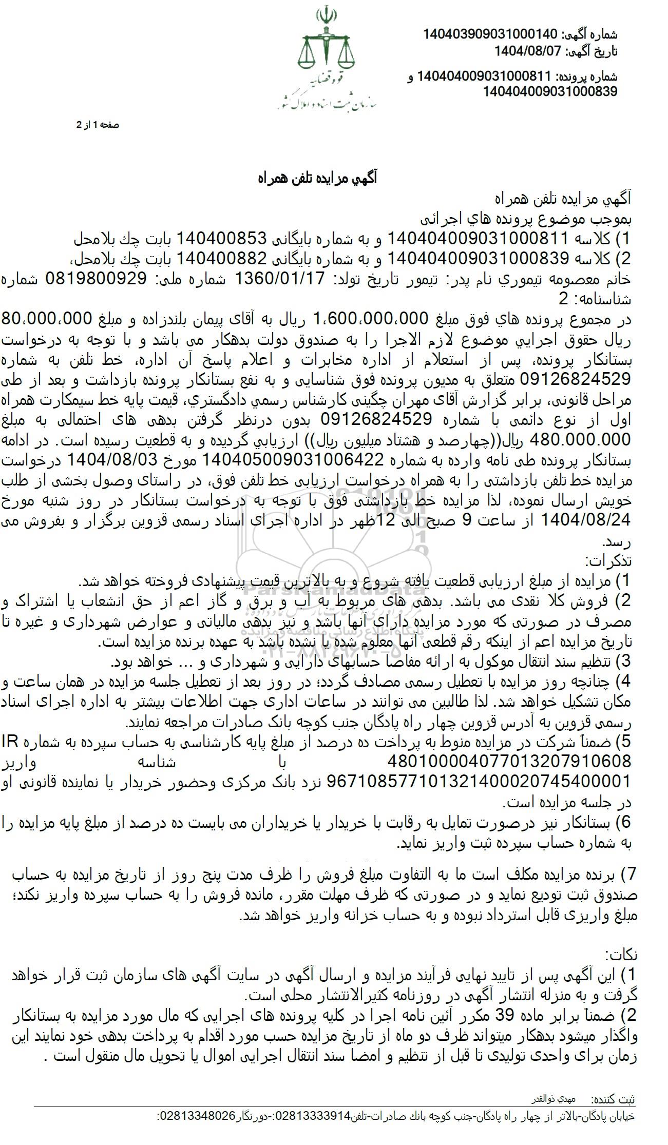 در مجموع پرونده های فوق مبلغ 1.600.000.000 ریال به آقای پیمان بلندزاده و مبلغ 80.000.000 ریال حقوق اجرایی موضوع لازم الاجرا را به صندوق دولت بدهکار میباشد و با توجه به درخواست بستانکار پرونده پس از استعلام از اداره مخابرات و اعلام پاسخ آن اداره خط تلفن به شماره 09126824529 متعلق به مدیون پرونده فوق شناسایی و به نفع بستانکار پرونده بازداشت و بعد از طی مراحل قانونی برابر گزارش آقای مهران چگینی کارشناس رسمی دادگستری قیمت پایه خط سیمکارت همراه اول از نوع دائمی با شماره 09126824529 بدون در نظر گرفتن بدهی های احتمالی به مبلغ 480.000.000 ریال چهارصد و هشتاد میلیون ریال ارزیابی گردیده و به قطعیت رسیده است. در ادامه بستانکار پرونده طی نامه وارده به شماره 140405009031006422 مورخ 1404.08.03 درخواست مزایده خط تلفن بازداشتی را به همراه درخواست ارزیابی خط تلفن فوق در راستای وصول بخشی از طلب خویش ارسال نموده، لذا مزایده خط بازداشتی فوق با توجه به درخواست بستانکار در روز شنبه مورخ 1404.08.24 از ساعت 9 صبح الى 12 ظهر در اداره اجرای اسناد رسمی قزوین برگزار و بفروش می رسد.