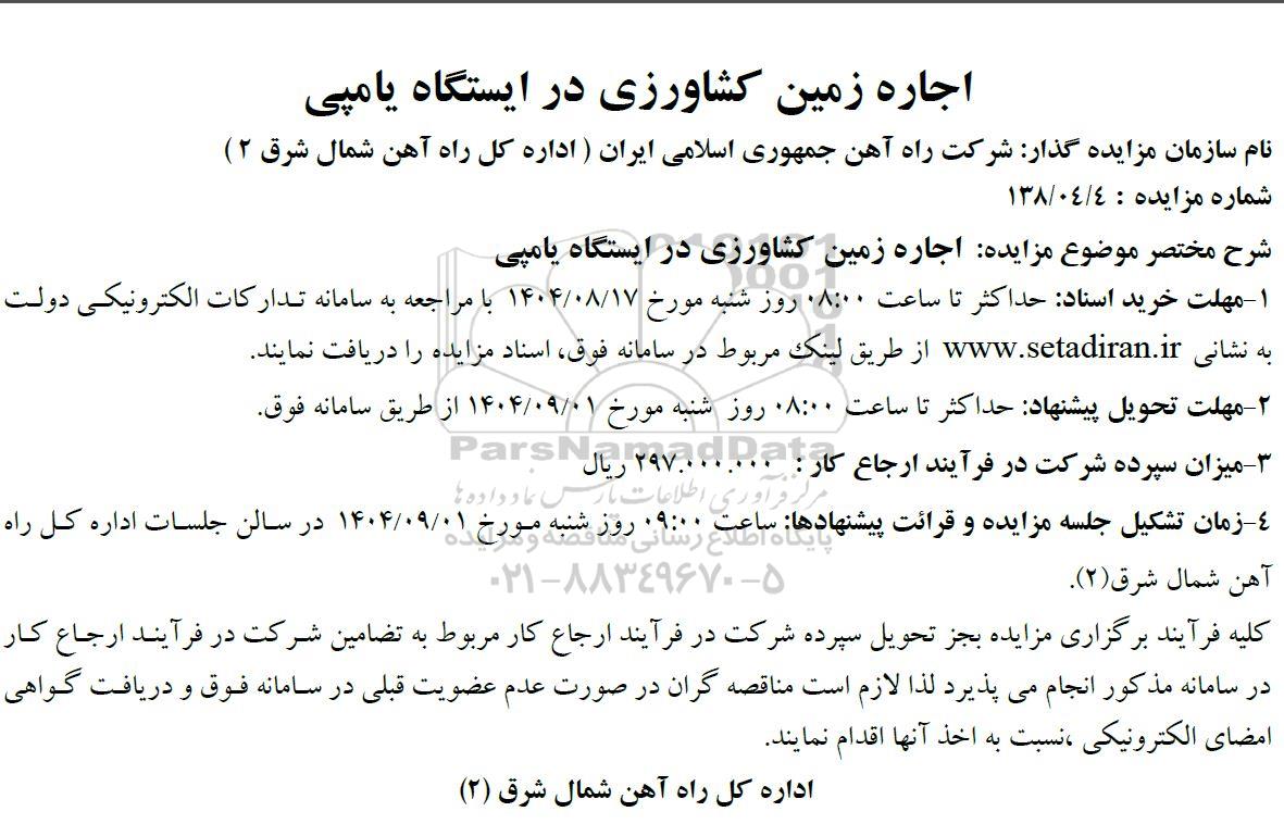 4- زمان تشکیل جلسه مزایده و قرائت پیشنهادها : ساعت 9:00 روز شنبه مورخ 1404.09.01 در سالن جلسات اداره کل راه آهن شمال شرق (2).