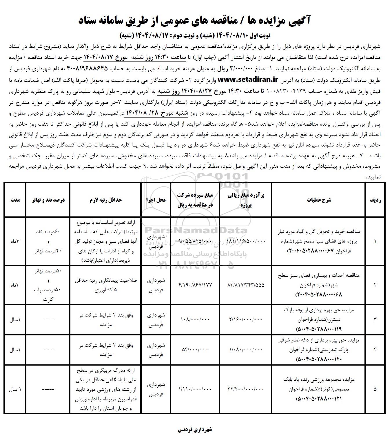 شهرداری فردیس در نظر دارد پروژه های ذیل را از طریق برگزاری مزایده مناقصه عمومی به متقاضیان واجد حداقل شرایط به شرح ذیل واگذار نماید (مشروح شرایط در اسناد مناقصه/ مزایده درج شده است ) لذا متقاضیان می توانند از تاریخ انتشار آگهی (چاپ اول ) تا ساعت 14:30 روز شنبه مورخ 1404.08.17 جهت خرید اسناد مناقصه / مزایده به سامانه الکترونیک دولت (ستاد) مراجعه نمایند. 1- مبلغ 2.000.000 ریال به عنوان هزینه خرید اسناد می بایست به حساب 400819688645 به نام شهرداری فردیس از طریق سامانه الکترونیک دولت (ستاد) به آدرس ستاد یاران واریز گردد 2- شرکت کنندگان می بایست نسبت به تحویل (صرفا پاکت الف) اصل ضمانت نامه با فیش واریز نقدی به شماره حساب 100823004139 تا ساعت 14:30 مورخ 1404.08.27 روز شنبه به آدرس فردیس - بلوار شهید سلیمانی رو به پارک منظریه شهرداری فردیس اقدام نمایند و هم زمان پاکات الف ب و ج در سامانه تدارکات الکترونیکی دولت ستاد ایران بارگذاری نمایند. 3- در صورت بروز هرگونه تناقص در موارد مندرج در آگهی با سامانه ستاد، ملاک عمل سامانه ستاد خواهد بود 4- پیشنهادات رسیده در روز شنبه مورخ 1404.08.28 در کمیسیون عالی معاملات شهرداری فردیس مطرح و پس از بررسی و کنترل برنده مناقصه / مزایده اعلام خواهد شد 5- هرگاه برنده مناقصه /مزایده از انجام معامله خودداری کنند با پس از ابلاغ قانونی حداکثر تا هفت روز حاضر به انعقاد قرار داد نشود سپرده وی به نفع شهرداری ضبط و قرارداد با نفر دوم منعقد خواهد گردید و در صورتی که برندگان دوم و سوم نیز ظرف مدت هفت روز پس از ابلاغ قانونی حاضر به عقد قرارداد نشوند سپرده آنان نیز به نفع شهرداری ضبط خواهد شد 6- شهرداری در رد یا قبول یک یا کلیه پیشنهادات شرکت کنندگان ذیصلاح مختار می باشد. 7- هزینه درج آگهی به عهده برنده مناقصه / مزایده می باشد 8 به پیشنهادات فاقد سپرده، سپرده های مخدوش، سپرده های کمتر از میزان مقرر چک شخصی و مشروط، مخدوش و پیشنهاداتی که بعد از مدت مقرر این آگهی واصل شود، مطلقاً ترتیب اثر داده نخواهد شد 9- جهت کسب اطلاعات بیشتر به محل شهرداری فردیس مراجعه نمایید.