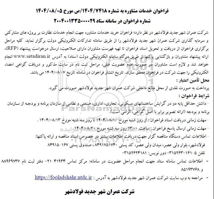 شرکت عمران شهر جدید فولاد شهر در نظر دارد؛ فراخوان خرید خدمات مشاوره جهت انجام خدمات نظارت بر پروژه های مشارکتی و سرمایه گذاری شرکت عمران شهر جدید فولاد شهر را از طریق سامانه تدارکات الکترونیکی دولت برگزار نماید. کلیه مراحل برگزاری فراخوان از دریافت و تحویل اسناد فراخوان تا تهیه فهرست مشاوران دارای صلاحیت ارسال درخواست پیشنهاد (RFP) ارائه پیشنهاد مشاوران و بازگشایی پاکتها از طریق درگاه سامانه الکترونیکی دولت (ستاد) ایران انجام خواهد شد و لازم است مشاوران در صورت عدم عضویت قبلی مراحل ثبت نام در سایت مذکور و دریافت گواهی امضاء الکترونیکی را جهت شرکت در فراخوان محقق سازند. تاریخ انتشار فراخوان در سامانه تاریخ 1404.8.7 می باشد.