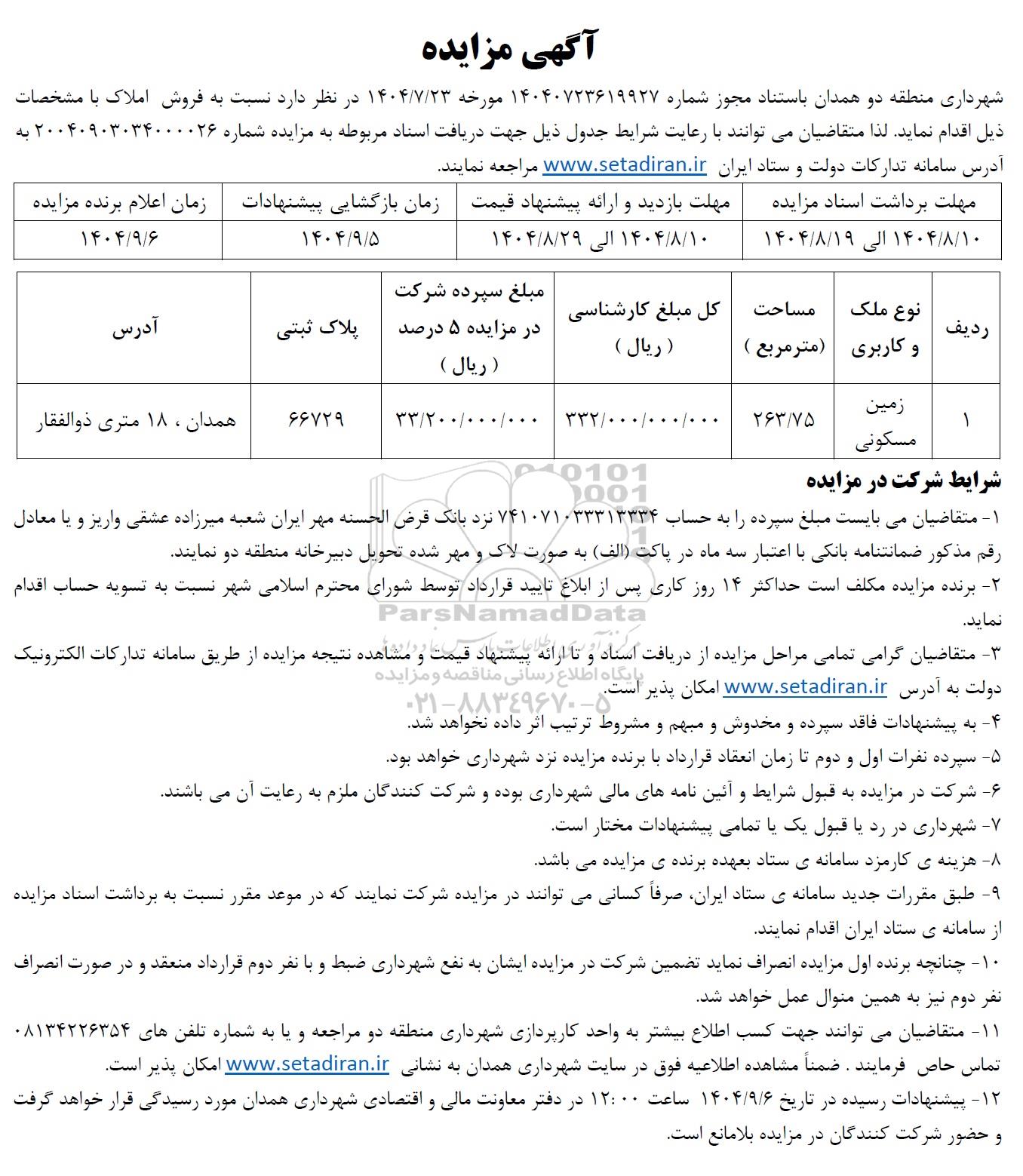 شهرداری منطقه دو همدان باستناد مجوز شماره 14040723619927 مورخه 1404.7.23 در نظر دارد نسبت به فروش املاک با مشخصات ذیل اقدام نماید لذا متقاضیان میتوانند با رعایت شرایط زمانی جدول ذیل جهت شرکت در مزایده شماره 20040903034000026 به سامانه تدارکات دولت به آدرس ستاد ایران  مراجعه نمایند.