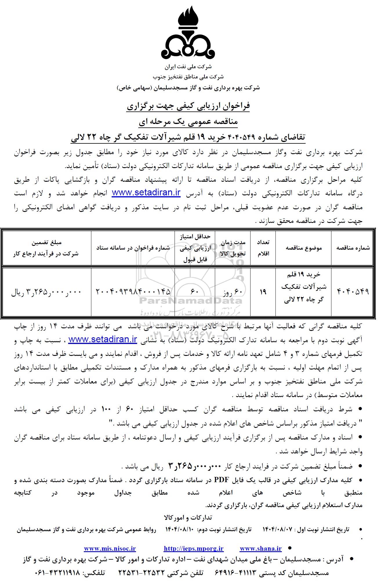 | 4040549 | خرید 19 قلم شیرآلات تفکیک گر چاه 22 لالی | 19 | 60 روز | 60 | 2004093984000145 | 3.265.000.000 ریال |