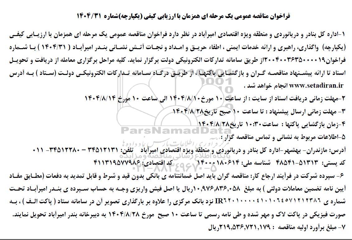 1- اداره کل بنادر و دریانوردی و منطقه ویژه اقتصادی امیرآباد در نظر دارد فراخوان مناقصه عمومی سک مرحله ای همزمان با ارزیابی کیفی (یکپارچه) واگذاری، راهبری و خدمات ایمنی، اطفاء حریق و امداد و نجات  آتش نشانی بندر امیراباد (1404/31 ) با شماره فراخوان (2004003635000019) را از طریق  سامانه تدارکات الکترونیکی دولت برگزار نماید کلیه مراحل برگزاری مناقصه از دریافت و تحویل اسناد تا ارائه پینشهاد مناقصه گران و بازگشایی پاکتها از طریق درگاه سامانه تدارکات الکترونیکی دولت ستاد به آدرس سامانه ستاد ایران انجام خواهد شد.