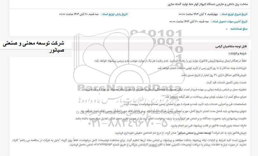 پیش فاکتور باید به نام شرکت توسعه معدنی و صنعتی صیانور صادر گردد. از درج نام اشخاص حقیقی خودداری فرمایید.