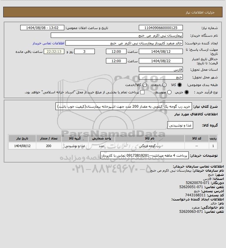 شرح کلی نیاز: خرید رب گوجه یک کیلویی به مقدار 200 عدد جهت اشپزخانه بیمارستان(کیفیت خوب باشد)