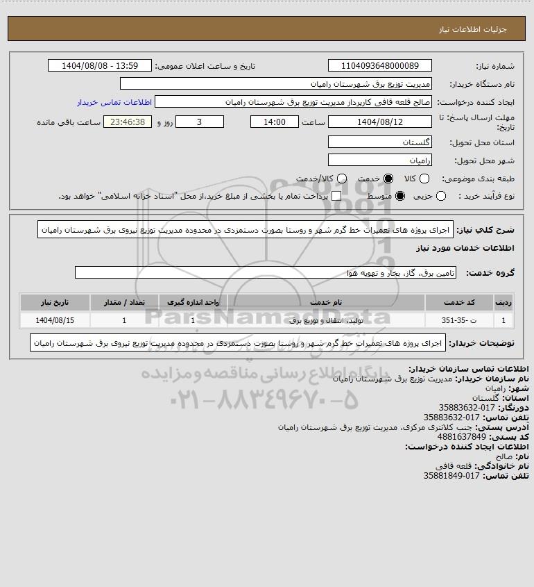 شرح کلی نیاز: اجرای پروژه های تعمیرات خط گرم شهر و روستا بصورت دستمزدی در محدوده مدیریت توزیع نیروی برق شهرستان رامیان