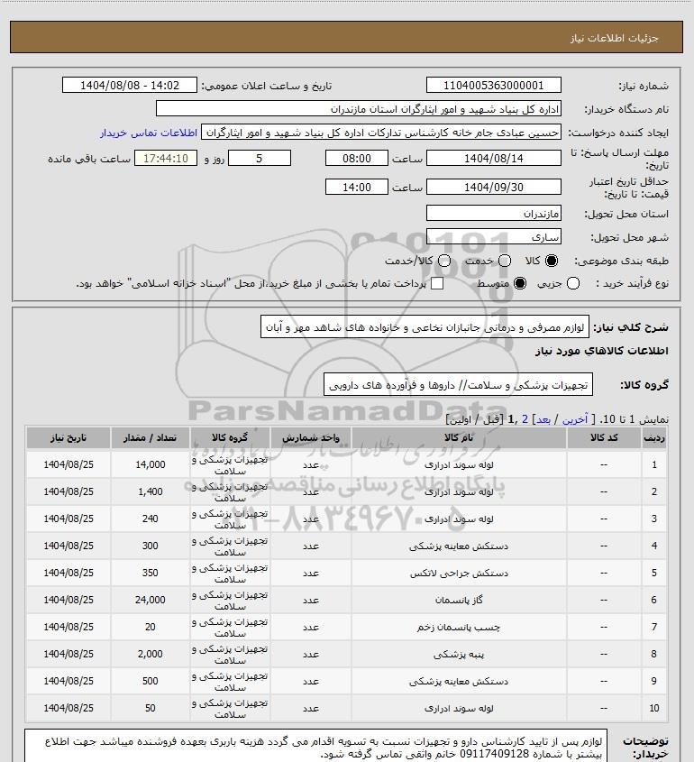 | 6 | -- | گاز پانسمان | عدد | تجهیزات پزشکی و سلامت | 24,000 | 1404/08/25 |