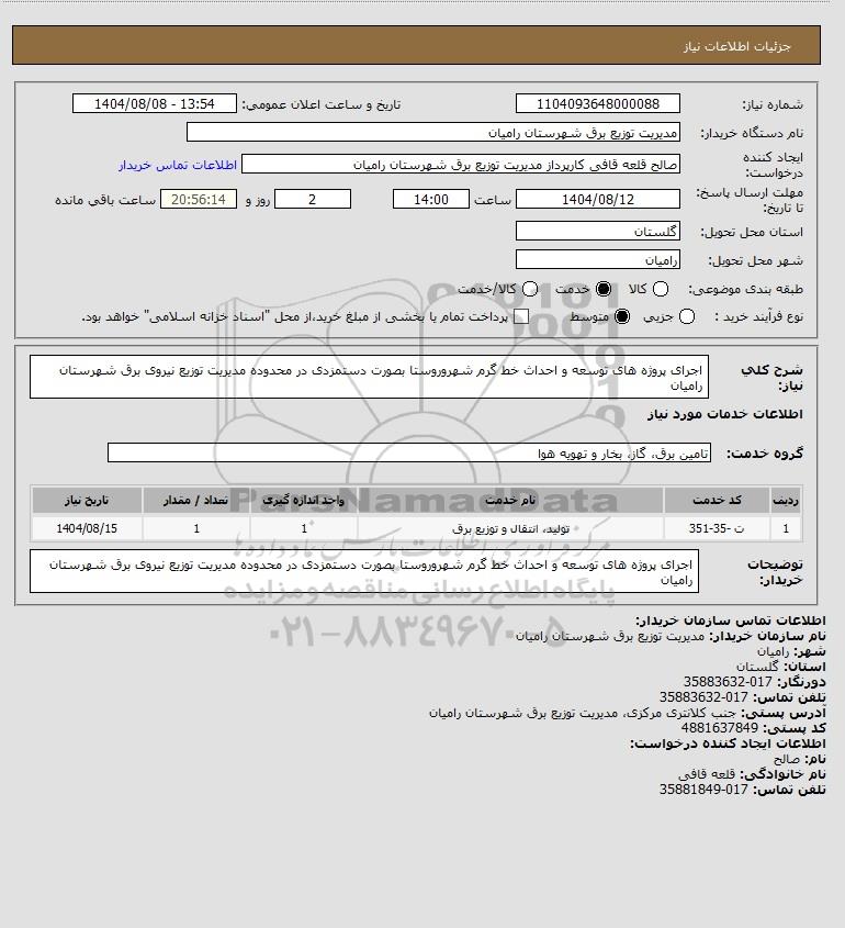 شرح کلی نیاز: اجرای پروژه های توسعه و احداث خط گرم شهروروستا بصورت دستمزدی در محدوده مدیریت توزیع نیروی برق شهرستان رامیان
