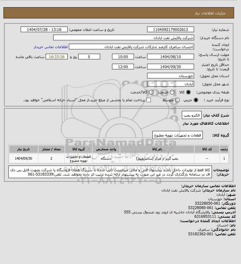 | 1 | -- | پمپ گریز از مرکز (سانتریفیوژ) | دستگاه | قطعات و تجهیزات تهویه مطبوع | 2 | 1404/09/30 |
