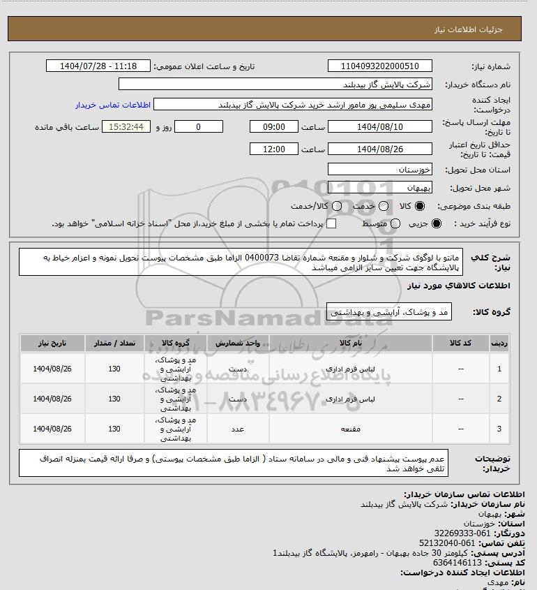 شرح کلی نیاز: مانتو با لوگوی شرکت و شلوار و مقنعه شماره تقاضا 0400073 الزاما طبق مشخصات پیوست تحویل نمونه و اعزام خیاط به پالایشگاه جهت تعیین سایز الزامی میباشد