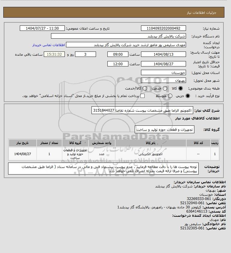 شرح کلی نیاز: اکچویتور الزاما طبق مشخصات پیوست شماره تقاضا 3151844027