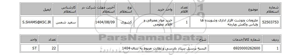 | 52503753 | ملزومات ونوشت افزار اداری وشوینده ها ولباس وکفش وپارچه | 1 | خرید مواد مصرفی و اقلام عمومی | کشوری | 1404/08/09 | سعید شمس | S.SHAMS@KSC.IR |