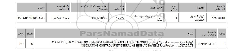 52505018کوپلینگ فوق اضطراری 1ساخت تجهیزات و قطعات یدکیکشوری1404/08/09مهدی ترکانیM.TORKANI@KSC.IR