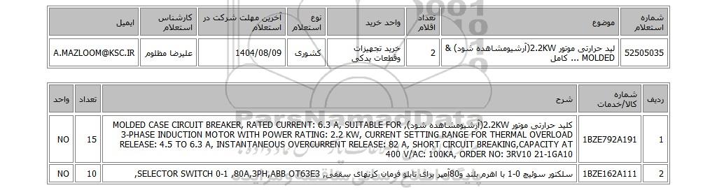 | 52505035 | لید حرارتی موتور 2.2KW(آرشیومشاهده شود) & MOLDED ... کامل | 2 | خرید تجهیزات وقطعات یدکی | کشوری | 1404/08/09 | علیرضا مظلوم | A.MAZLOOM@KSC.IR |