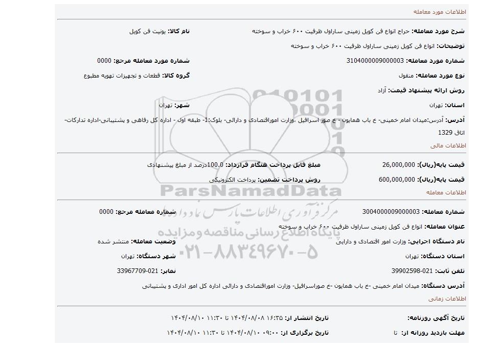 | قیمت پایه(ریال): 600,000,000 | روش پرداخت تضمین: پرداخت الکترونیکی |
