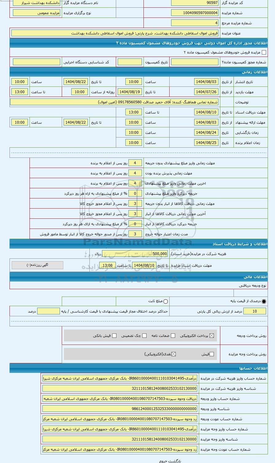 | شماره حساب واریز وجه مزایده | درآمدی-IR860100004001110103041495- بانک مرکزی جمهوری اسلامی ایران شعبه مرکزی شیراز |