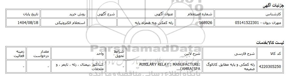 | مهران دیوان - 05141522301 | 168926 | رله کمکی وبه همراه پایه | استعلام الکترونیکی | 1404/08/18 |