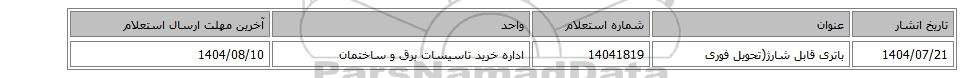 | 1404/07/21 | باتری قابل شارژ(تحویل فوری | 14041819 | اداره خرید تاسیسات برق و ساختمان | 1404/08/10 |
