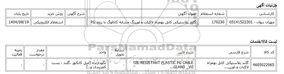 | مهران دیوان - 05141522301 | 170230 | گلند پلاستیکی کابل بهمراه لاکنات و اورینگ مشابه کاتالوگ با رزوه PG | استعلام الکترونیکی | 1404/08/19 |