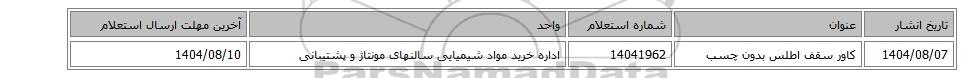 | 1404/08/07 | کاور سقف اطلس بدون چسب | 14041962 | اداره خرید مواد شیمیایی سالنهای مونتاژ و پشتیبانی | 1404/08/10 |