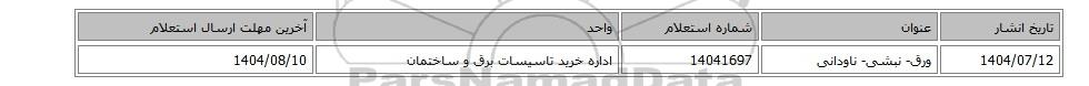 | 1404/07/12 | ورق- نبشی- ناودانی | 14041697 | اداره خرید تاسیسات برق و ساختمان | 1404/08/10 |