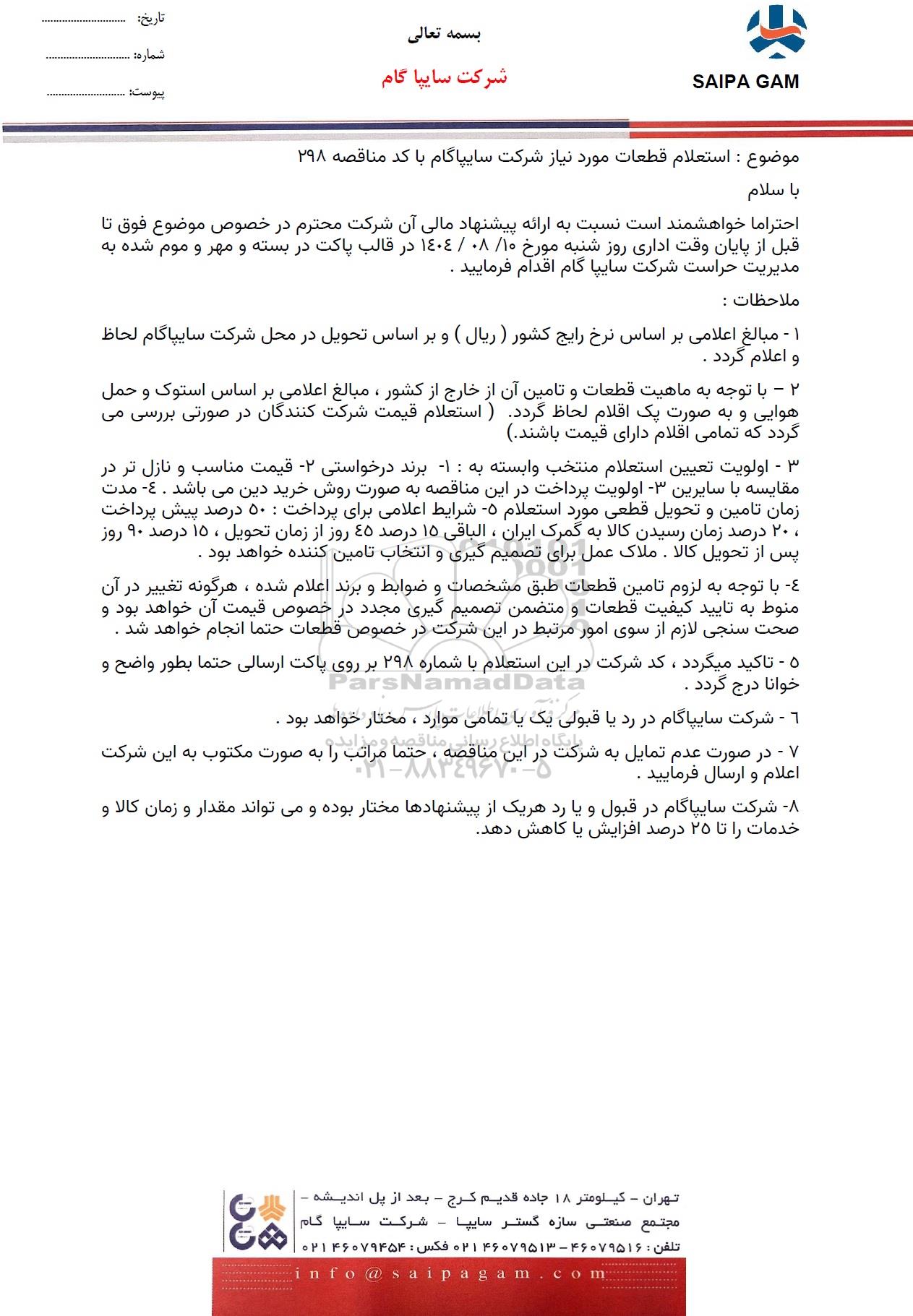موضوع: استعلام قطعات مورد نیاز شرکت سایپاگام با کد مناقصه 298