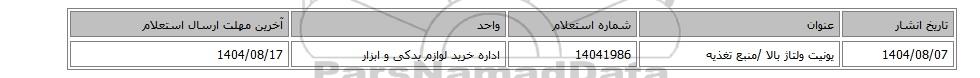 | 1404/08/07 | یونیت ولتاژ بالا /منبع تغذیه | 14041986 | اداره خرید لوازم یدکی و ابزار | 1404/08/17 |