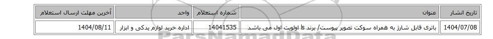 | 1404/07/08 | باتری قابل شارژ به همراه سوکت تصویر پیوست/ برند ls اولویت اول می باشد | 14041535 | اداره خرید لوازم یدکی و ابزار | 1404/08/11 |