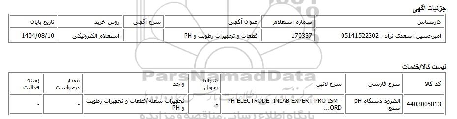 | امیرحسین اسعدی نژاد - 05141522302 | 170337 | قطعات و تجهیزات رطوبت و PH | استعلام الکترونیکی | 1404/08/10 |