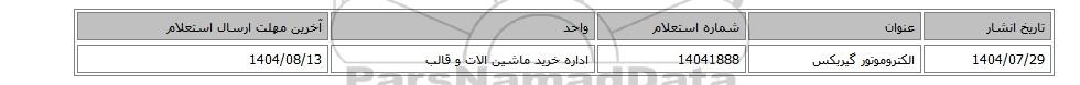 | 1404/07/29 | الکتروموتور گیربکس | 14041888 | اداره خرید ماشین الات و قالب | 1404/08/13 |