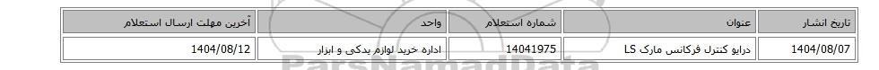 | 1404/08/07 | درایو کنترل فرکانس مارک LS | 14041975 | اداره خرید لوازم یدکی و ابزار | 1404/08/12 |