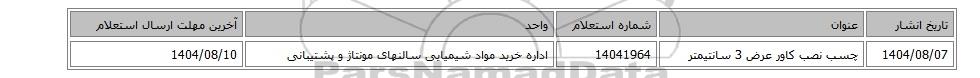 | 1404/08/07 | چسب نصب کاور عرض 3 سانتیمتر | 14041964 | اداره خرید مواد شیمیایی سالنهای مونتاژ و پشتیبانی | 1404/08/10 |