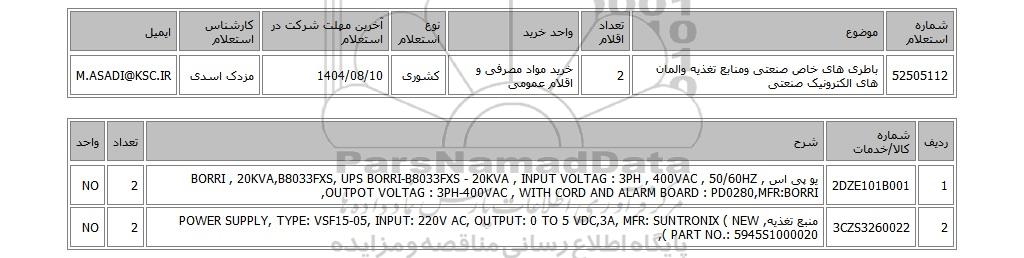 | 52505112 | باطری های خاص صنعتی ومنابع تغذیه والمان های الکترونیک صنعتی | 2 | خرید مواد مصرفی و اقلام عمومی | کشوری | 1404/08/10 | مزدک اسدی | M.ASADI@KSC.IR |