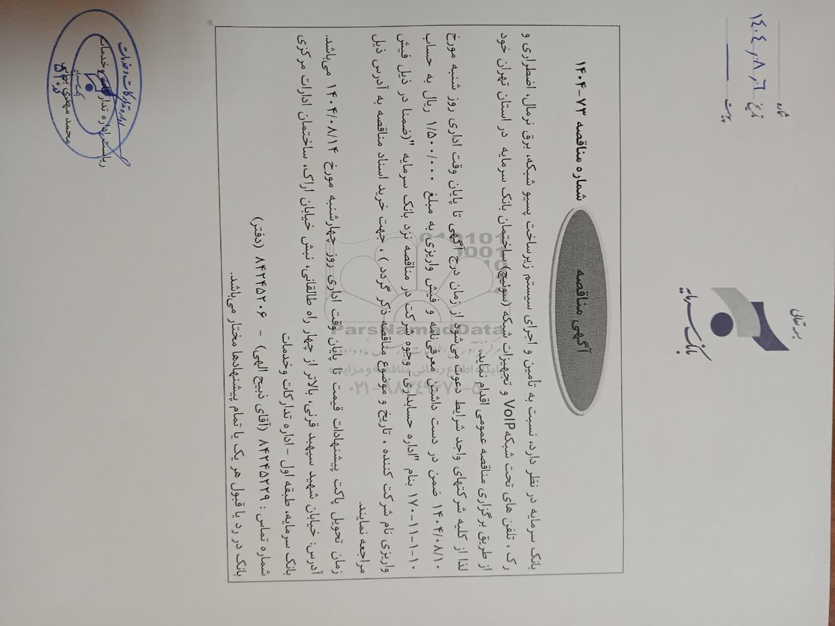 زمان تحویل پاکت پیشنهادات قیمت تا پایان وقت اداری روز چهارشنبه مورخ 1404.08.14 می باشد. آدرس: خیابان شهید سپهبد قرنی، بالاتر از چهارراه طالقانی، نبش خیابان اراک، ساختمان ادارات مرکزی بانک سرمایه، طبقه اول - اداره تدارکات و خدمات