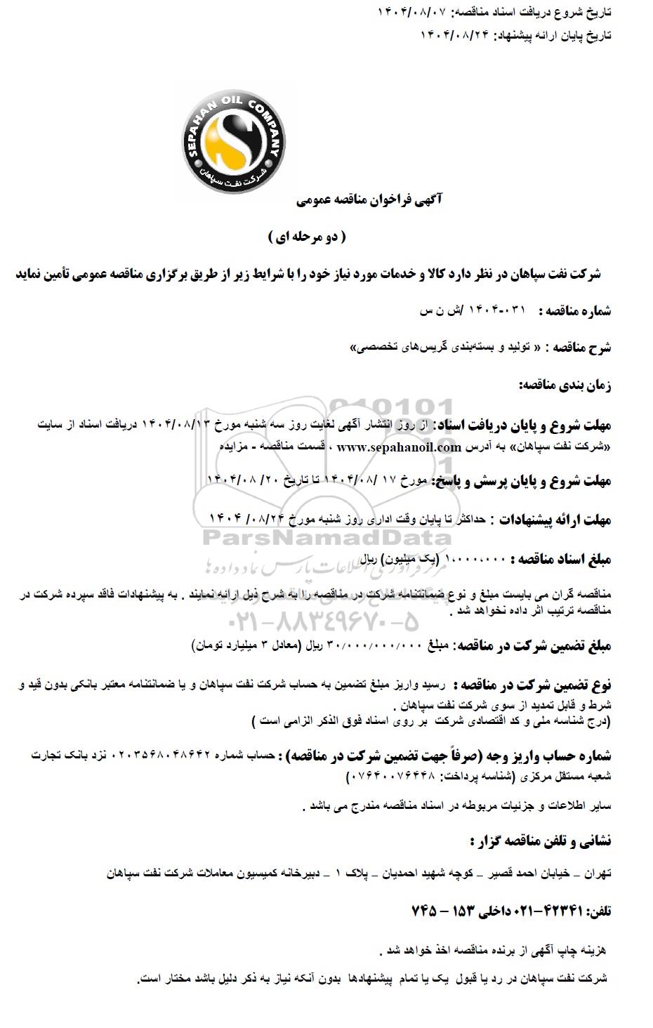 مناقصه عمومی تولید و بسته بندی گریس های تخصصی از کلیه افراد متخصص و شرکتها واجد شرایط دعوت به عمل میآید در مناقصه با کد خبرگزاری پارس نماد: 9776980 شرکت نمایند.