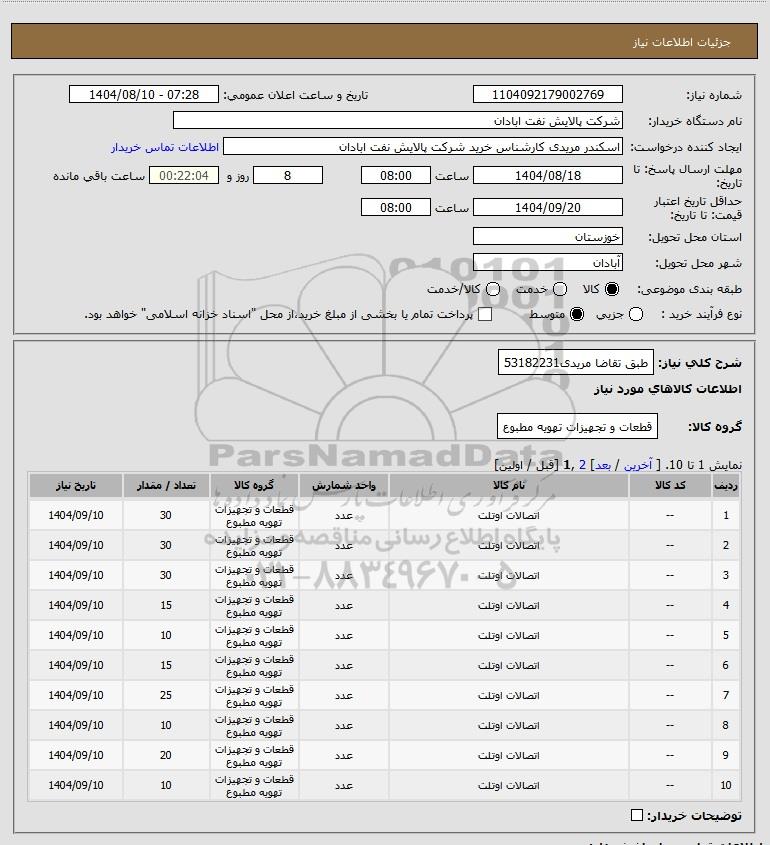 | 8 | -- | اتصالات اوتلت | عدد | قطعات و تجهیزات تهویه مطبوع | 10 | 1404/09/10 |