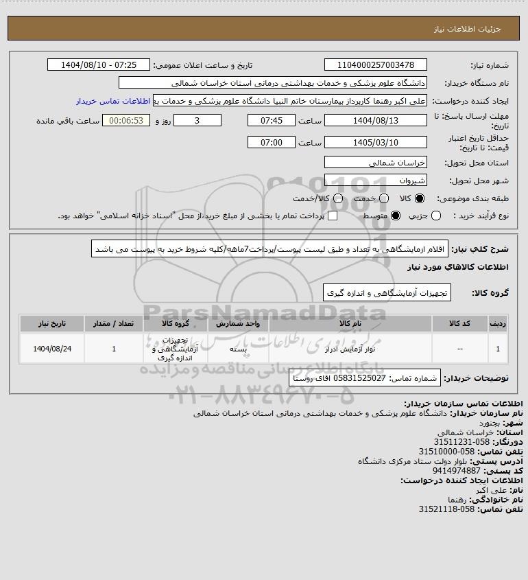 نام دستگاه خریدار:دانشگاه علوم پزشکی و خدمات بهداشتی درمانی استان خراسان شمالی
