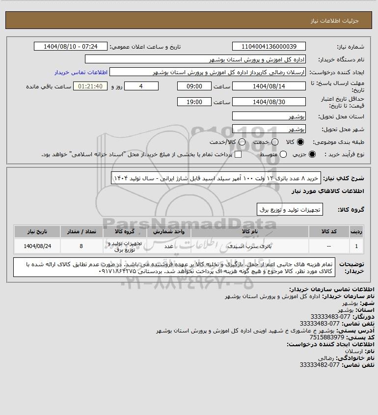 | 1 | -- | باتری سرب اسیدی | عدد | تجهیزات تولید و توزیع برق | 8 | 1404/08/24 |
