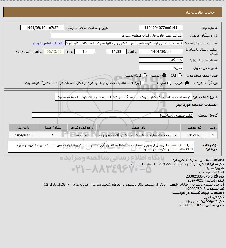 شرح کلی نیاز: تهیه، نصب و راه اندازی کولر بر روی دو دستگاه بنز 1924 سوخت رسان هواپیما منطقه سیری