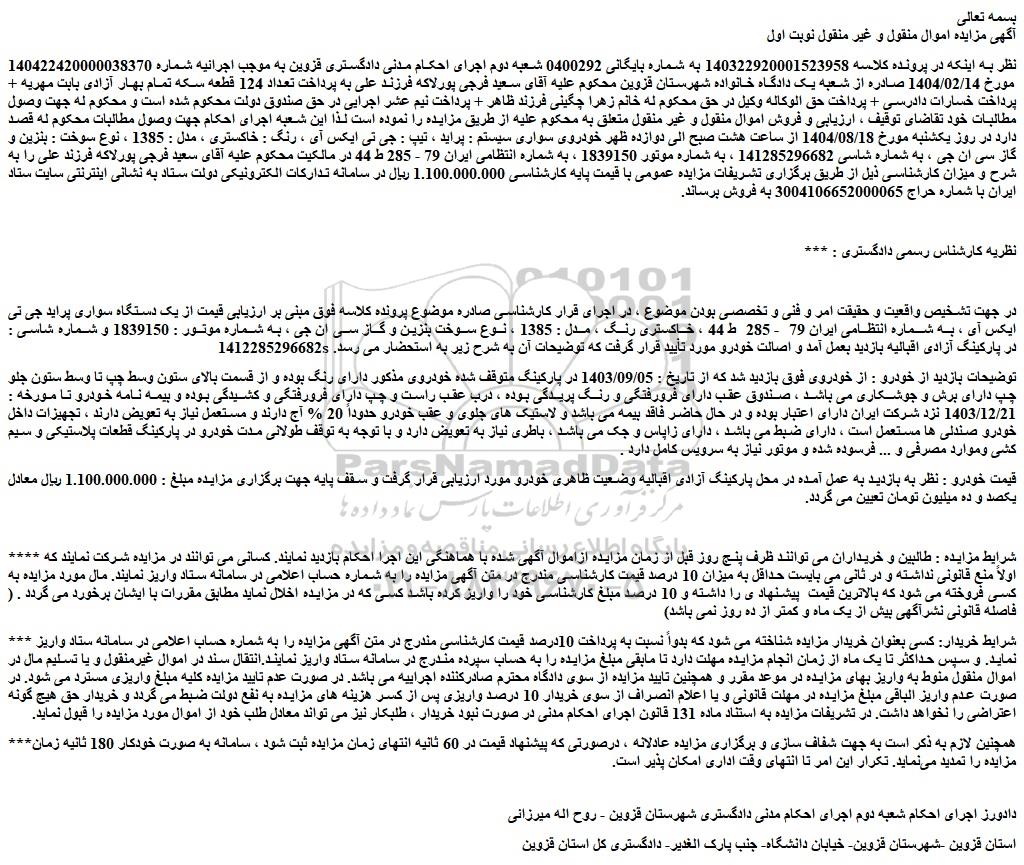 نظر به اینکه در پرونده کلاسه 140322920001523958 به شماره بایگانی 0400292 شعبه دوم اجرای احکام مدنی دادگستری قزوین به موجب اجرائیه شماره 140422420000038370 مورخ 1404/02/14 صادره از شعبه یک دادگاه خانواده شهرستان قزوین محکوم علیه آقای سعید فرجی پورلاکه فرزند علی به پرداخت تعداد 124 قطعه سکه تمام بهار آزادی بابت مهریه + پرداخت خسارات دادرسی + پرداخت حق الوکاله وکیل در حق محکوم له خانم زهرا چگینی فرزند ظاهر + پرداخت نیم عشر اجرایی در حق صندوق دولت محکوم شده است و محکوم له جهت وصول مطالبات خود تقاضای توقیف ، ارزیابی و فروش اموال منقول و غیر منقول متعلق به محکوم علیه از طریق مزایده را نموده است لذا این شعبه اجرای احکام جهت وصول مطالبات محکوم له قصد دارد در روز یکشنبه مورخ 1404/08/18 از ساعت هشت صبح الی دوازده ظهر خودروی سواری سیستم : پراید ، تیپ : جی تی ایکس آی ، رنگ : خاکستری ، مدل : 1385 ، نوع سوخت : بنزین و گاز سی ان جی ، به شماره شاسی 141285296682 ، به شماره موتور 1839150 ، به شماره انتظامی ایران 79 - 285 ط 44 در مالکیت محکوم علیه آقای سعید فرجی پورلاکه فرزند علی را به شرح و میزان کارشناسی ذیل از طریق برگزاری تشریفات مزایده عمومی با قیمت پایه کارشناسی 1.100.000.000 ریال در سامانه تدارکات الکترونیکی دولت ستاد به نشانی اینترنتی سایت ستاد ایران با شماره حراج 3004106652000065 به فروش برساند.