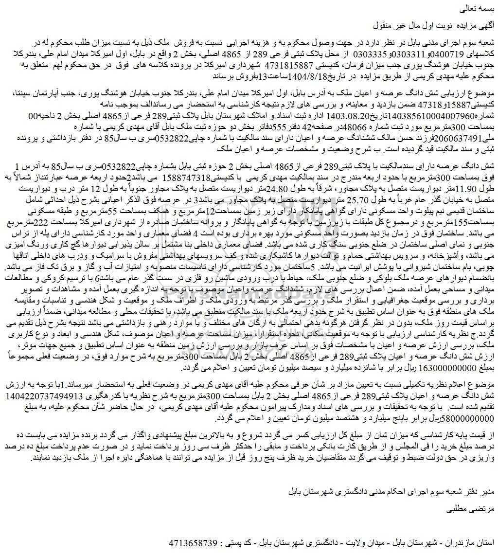 شعبه سوم اجرای مدنی بابل در نظر دارد در جهت وصول محکوم به و هزینه اجرایی نسبت به فروش ملک ذیل به نسبت میزان طلب محکوم له در کلاسهای 0400719و0303311و0303335 از محل پلاک ثبتی فرعی 289 از 4865 اصلی، بخش 2 واقع در بابل، اول امیرکلا میدان امام علی، بندرکلا جنوب خیابان هوشنگ پوری جنب میزان فرمان، کدپستی 4731815887 شهرداری امیرکلا در پرونده کلاسه های فوق در حق محکوم لهم متعلق به محکوم علیه مهدی کریمی از طریق مزایده در تاریخ1404/8/18ساعت13بفروش برساند