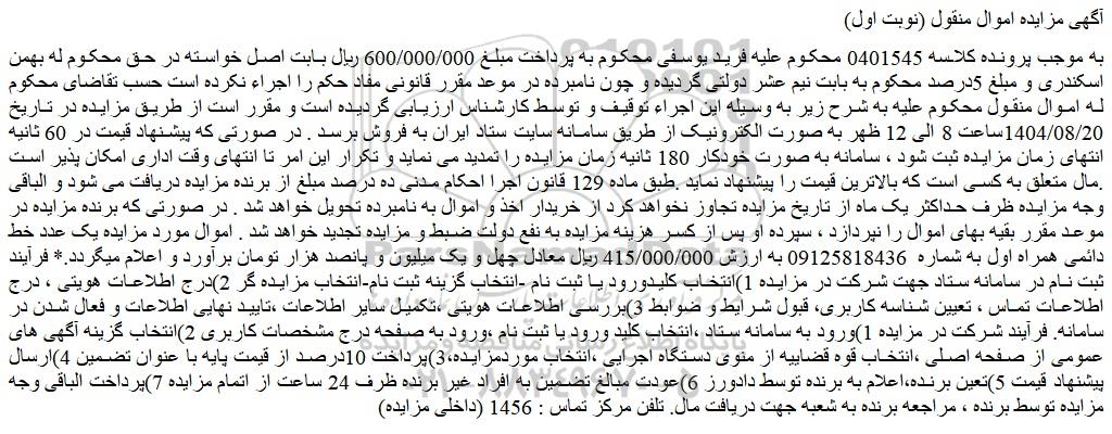 به موجب پرونده کلاسه 0401545 محکوم علیه فرید یوسفی محکوم به پرداخت مبلغ 600/000/000 ریال بابت اصل خواسته در حق محکوم له بهمن اسکندری و مبلغ 5درصد محکوم به بابت نیم عشر دولتی گردیده و چون نامبرده در موعد مقرر قانونی مفاد حکم را اجراء نکرده است حسب تقاضای محکوم له اموال منقول محکوم علیه به شرح زیر به وسیله این اجراء توقیف و توسط کارشناس ارزیابی گردیده است و مقرر است از طریق مزایده در تاریخ 1404/08/20ساعت 8 الی 12 ظهر به صورت الکترونیک از طریق سامانه سایت ستاد ایران به فروش برسد . در صورتی که پیشنهاد قیمت در 60 ثانیه انتهای زمان مزایده ثبت شود ، سامانه به صورت خودکار 180 ثانیه زمان مزایده را تمدید می نماید و تکرار این امر تا انتهای وقت اداری امکان پذیر است .مال متعلق به کسی است که بالاترین قیمت را پیشنهاد نماید .طبق ماده 129 قانون اجرا احکام مدنی ده درصد مبلغ از برنده مزایده دریافت می شود و الباقی وجه مزایده ظرف حداکثر یک ماه از تاریخ مزایده تجاوز نخواهد کرد از خریدار اخذ و اموال به نامبرده تحویل خواهد شد . در صورتی که برنده مزایده در موعد مقرر بقیه بهای اموال را نپردازد ، سپرده او پس از کسر هزینه مزایده به نفع دولت ضبط و مزایده تجدید خواهد شد . اموال مورد مزایده یک عدد خط دائمی همراه اول به شماره  09125818436 به ارزش 415/000/000 ریال معادل چهل و یک میلیون و پانصد هزار تومان برآورد و اعلام میگردد.* فرآیند ثبت نام در سامانه ستاد جهت شرکت در مزایده 1)انتخاب کلیدورود یا ثبت نام -انتخاب گزینه ثبت نام-انتخاب مزایده گر 2)درج اطلاعات هویتی ، درج اطلاعات تماس ، تعیین شناسه کاربری، قبول شرایط و ضوابط 3)بررسی اطلاعات هویتی ،تکمیل سایر اطلاعات ،تایید نهایی اطلاعات و فعال شدن در سامانه. فرآیند شرکت در مزایده 1)ورود به سامانه ستاد ،انتخاب کلید ورود یا ثبت نام ،ورود به صفحه درج مشخصات کاربری 2)انتخاب گزینه آگهی های عمومی از صفحه اصلی ،انتخاب قوه قضاییه از منوی دستگاه اجرایی ،انتخاب موردمزایده،3)پرداخت 10درصد از قیمت پایه با عنوان تضمین 4)ارسال پیشنهاد قیمت 5)تعین برنده،اعلام به برنده توسط دادورز 6)عودت مبالغ تضمین به افراد غیر برنده ظرف 24 ساعت از اتمام مزایده 7)پرداخت الباقی وجه مزایده توسط برنده ، مراجعه برنده به شعبه جهت دریافت مال. تلفن مرکز تماس : 1456 (داخلی مزایده)