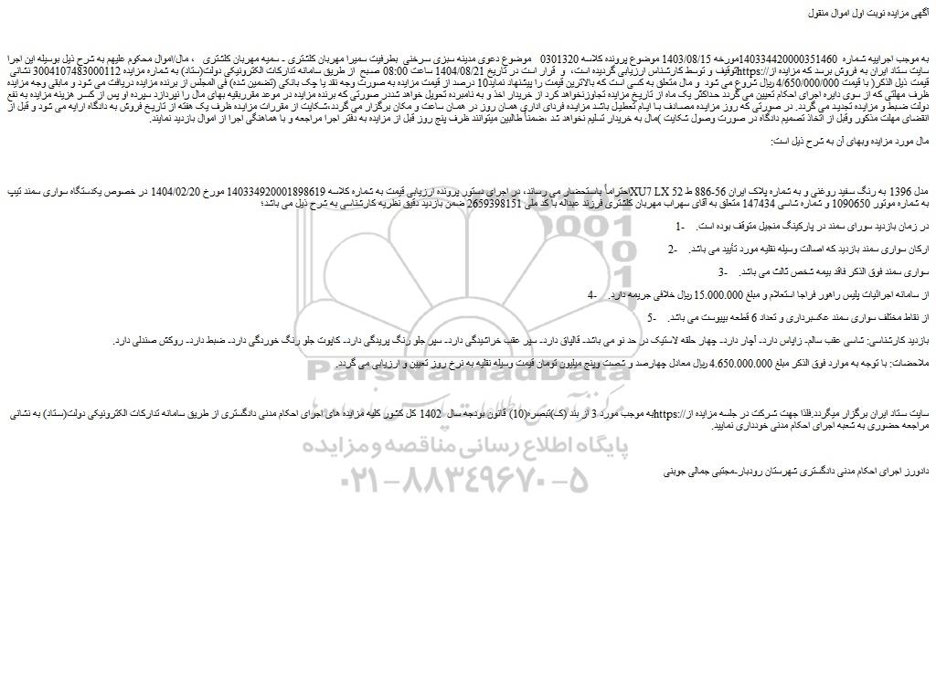 ملاحضات: با توجه به موارد فوق الذکر مبلغ 4.650.000.000 ریال معادل چهارصد و شصت وپنج میلیون تومان قیمت وسیله نقلیه به نرخ روز تعیین و ارزیابی می گردد.
