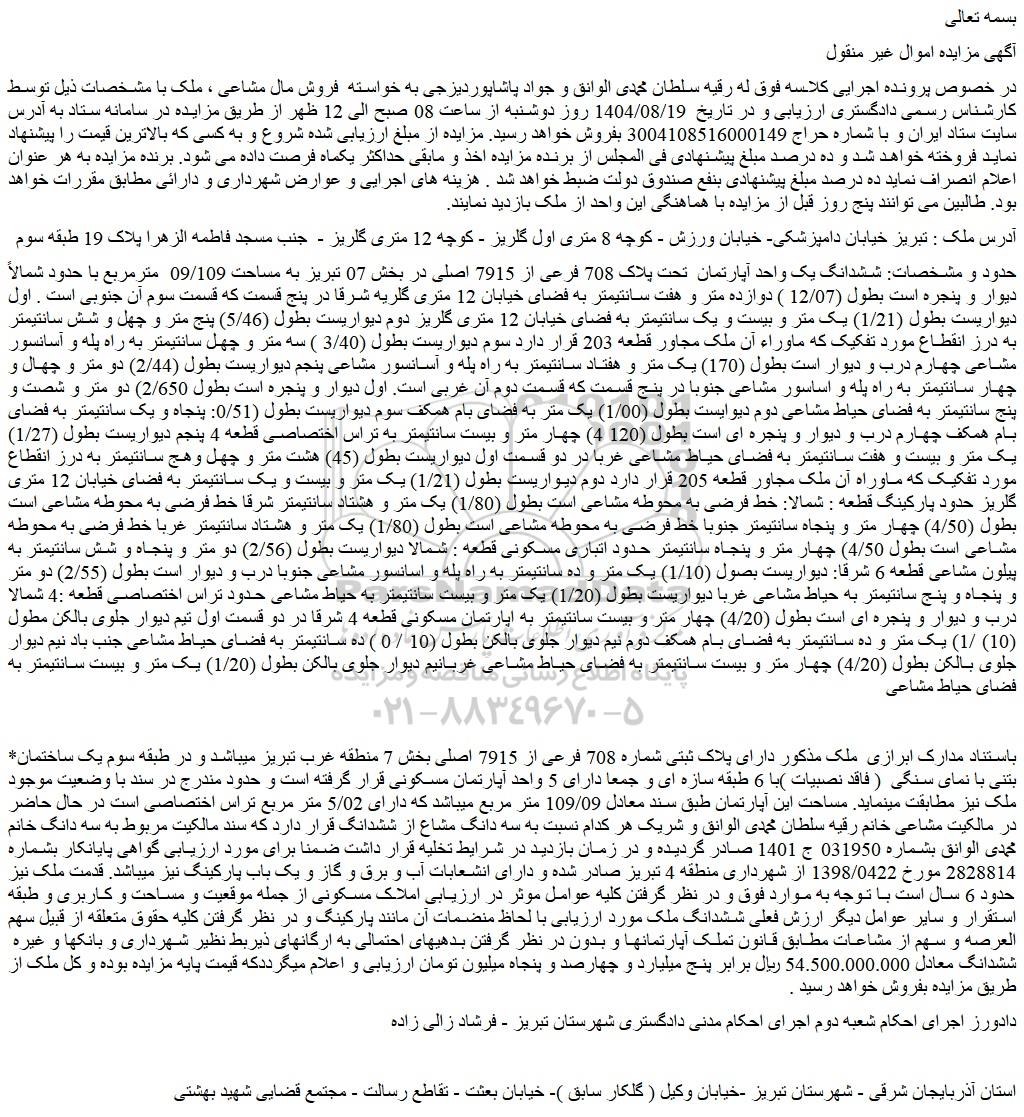 مزایده ششدانگ یک واحد آپارتمان  تحت پلاک 708 فرعی از 7915 اصلی