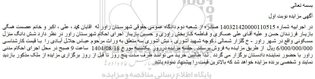 در اجراییه شماره 140321420000110515 صادره از شعبه دوم دادگاه عمومی حقوقی شهرستان راور له اقایان محمد ، علی ، اکبر و خانم عصمت همگی بازیار فرزندان حسن و علیه آقای علی عسکری و فاطمه کاربخش راوری و حسین بازیار اجرای احکام شهرستان راور در نظر دارد شش دانگ منزل مسکونی واقع در شهر راور - خ گلزار شمالی ـ کوچه شهید آشوری - نبش آشوری سه متعلق به وراث مرحوم عباس جلال آبادی را با قیمت کارشناسی 6/000/000/000 ریال از طریق مزایده به فروش برساند . جلسه مزایده درروز یکشنبه مورخ 1404/08/18 ساعت 9 صبح در محل اجرای احکام مدنی راور با حضور نماینده دادستان برگزار می گردد . لذا طالبین خرید می توانند ظرف مدت پنج روز تا قبل از روز برگزاری مزایده از ملک مذکور بازدید نمایند و شخصی برنده مزایده خواهد شد که بالاترین قیمت را پیشنهاد نموده باشد.