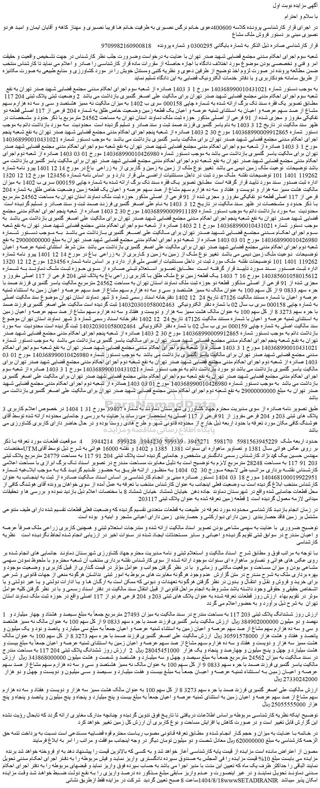 در اجرای قرار کارشناسی پرونده کلاسه 400600دعوی خانم نرگس نصیری به طرفیت خانم ها فریبا نصیری و مهناز کاهه و آقایان ایمان و امید هردو نصیری مبنی بر دستور فروش ملک مشاع