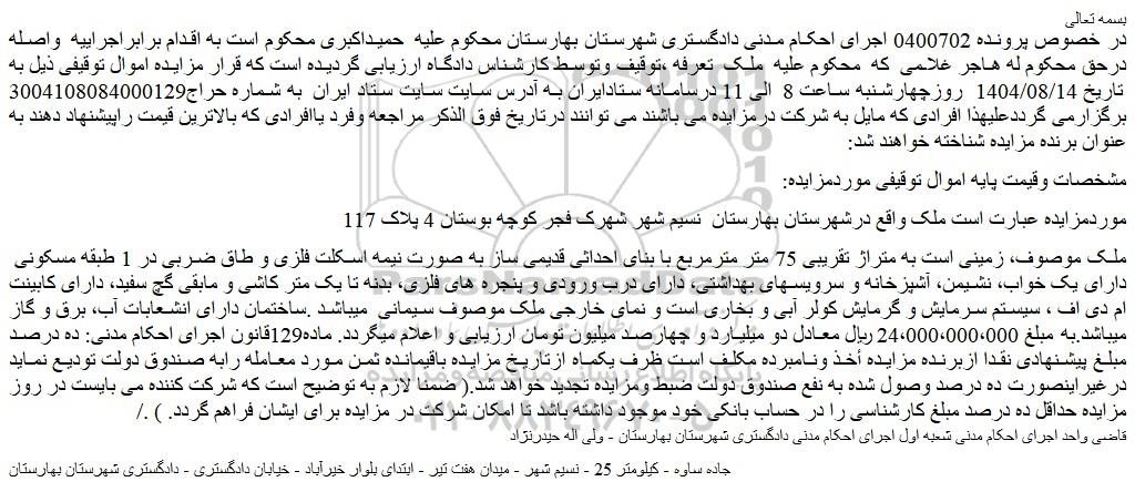 در خصوص پرونده 0400702 اجرای احکام مدنی دادگستری شهرستان بهارستان محکوم علیه حمیداکبری محکوم است به اقدام برابراجراییه واصله درحق محکوم له هاجر غلامی که محکوم علیه ملک تعرفه ،توقیف وتوسط کارشناس دادگاه ارزیابی گردیده است که قرار مزایده اموال توقیفی ذیل به تاریخ 1404/08/14 روزچهارشنبه ساعت 8 الی 11 درسامانه ستادایران به آدرس سایت سایت ستاد ایران به شماره حراج3004108084000129 برگزارمی گرددعلیهذا افرادی که مایل به شرکت درمزایده می باشند می توانند درتاریخ فوق الذکر مراجعه وفرد یاافرادی که بالاترین قیمت راپیشنهاد دهند به عنوان برنده مزایده شناخته خواهند شد: